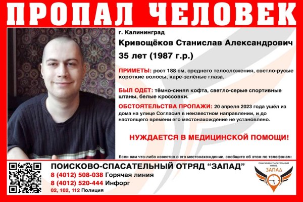 Родные и волонтеры разыскивают 35-летнего Станислава Кривощекова, пропавшего 20 апреля. Он может нуждаться в медицинской помощи, сообщает Поисково-спасательный отряд «Запад» в соцсетях.