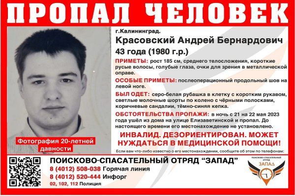 В Калининграде разыскивают 43-летнего Андрея Красовского, пропавшего в ночь на понедельник. У мужчины инвалидность, он дезориентирован и может нуждаться в медпомощи, сообщает Поисково-спасательный отряд «Запад» в соцсетях.
