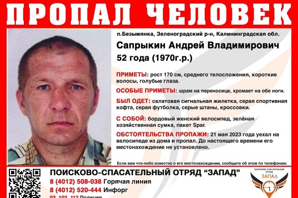 Мужчина проживает в поселке Безымянка Зеленоградского района. 21 мая он уехал из дома на бордовом женском велосипеде и пропал. При себе у Сапрыкина была зеленая хозяйственная сумка и пакет «Спар».