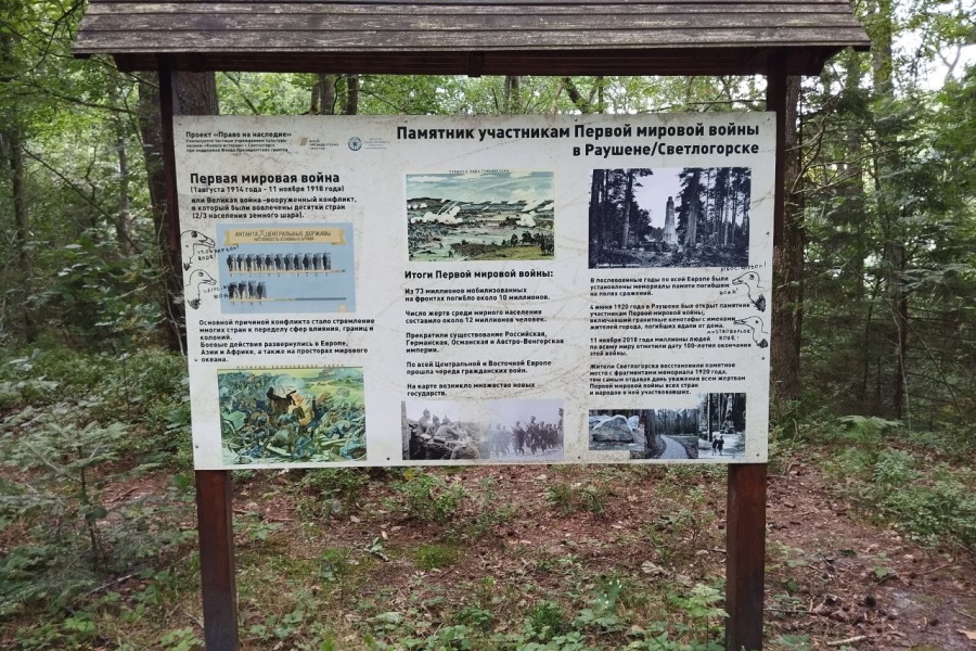 Оскверненный памятник, как уточнила Быстрова, был создан на берегу сегодняшнего Тихого озера в июне 1920 года на средства местной общины. Изначально в центре композиции стояла каменная стела с навершием в виде «Железного креста». Вокруг нее были установлены кенотафы в честь погибших во время Первой мировой уроженцев города-курорта.