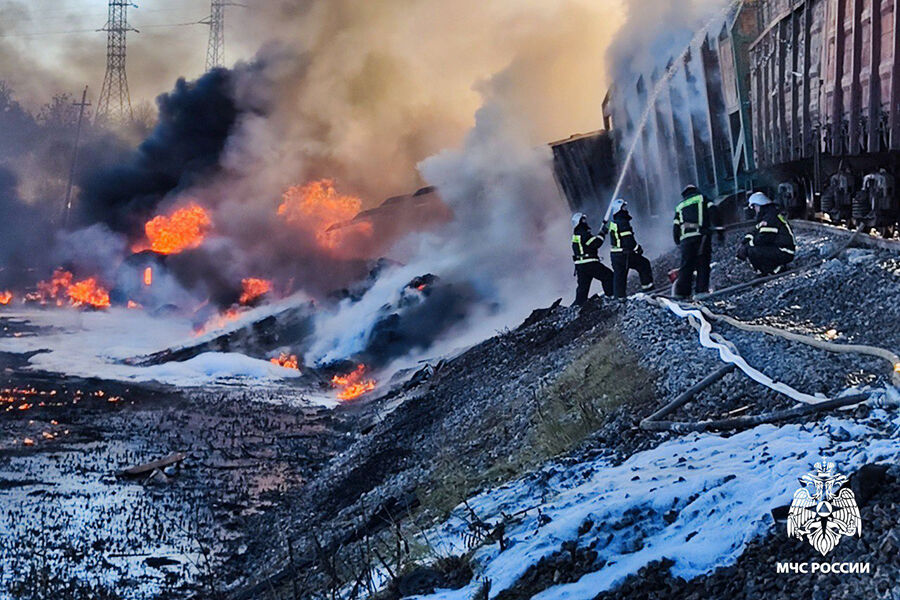 Для устранения последствий ДТП на место направлены три пожарных поезда и четыре восстановительных поезда. Движение поездов на участке приостановлено.