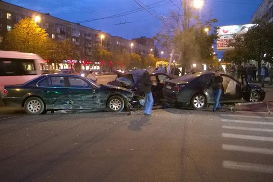 По их словам, «Мерседес», двигавшийся в направлении от центра города, пытался повернуть на улицу Краснооктябрьскую. В это время в него врезались сразу два вылетевших на перекресток «БМВ». Авто влетели в ограду пешеходного тротуара, задели фонарь. На тротуаре в этот момент находились люди. По предварительным данным, в результате ДТП пострадала молодая женщина, она получила сильный удар в голову. Подробности уточняются.