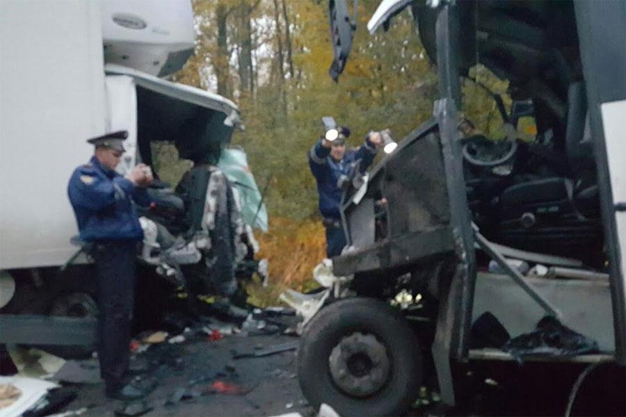 Напомним, по данным УМВД, 26-летний мужчина, управляя грузовиком, грубо нарушил правила дорожного движения. На повороте он не справился с управлением, после чего грузовик пересек сплошную линию разметки, выехал на встречную полосу движения, где лоб в лоб столкнулся с рейсовым автобусом.