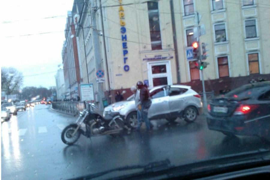 По словам очевидцев, машина и мотоцикл столкнулись на мокрой трассе у поворота на Гвардейский проспект с ул. Театральной. В аварии никто из людей не пострадал. Участники ожидают приезда ГИБДД. Образуется затор.
