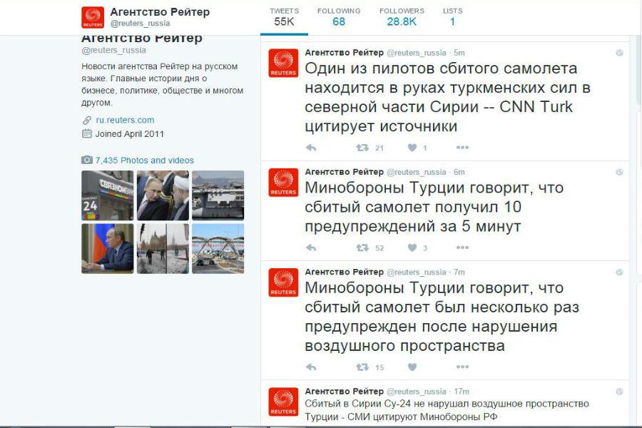 «Минобороны Турции говорит, что сбитый самолет получил 10 предупреждений за 5 минут», — отмечают журналисты агентства. И со ссылкой на «CNN Turk» сообщают, что один из пилотов сбитого самолета находится в руках туркменских сил в северной части Cирии.