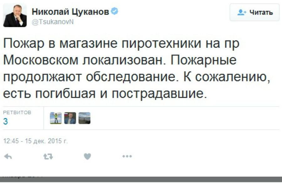 «Пожар в магазине пиротехники на пр Московском локализован. Пожарные продолжают обследование. К сожалению, есть погибшая и пострадавшие», — отметил губернатор.