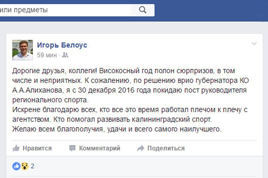 Глава агентства по спорту Калининградской области Игорь Белоус покидает свой пост. Об этом сам Белоус сообщил в пятницу на своей странице в Facebook*.