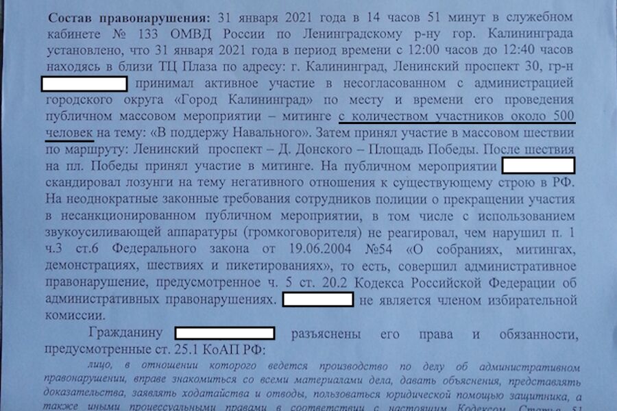 Отраженная в нынешних протоколах цифра также превышает ту, которая указана в протоколах, составленных по итогам акции 23 января. В них полицейские оценивали количество участников в 350 человек. Таким образом, если верить полицейским протоколам, вторая протестная акция в Калининграде по числу участников превысила первую.