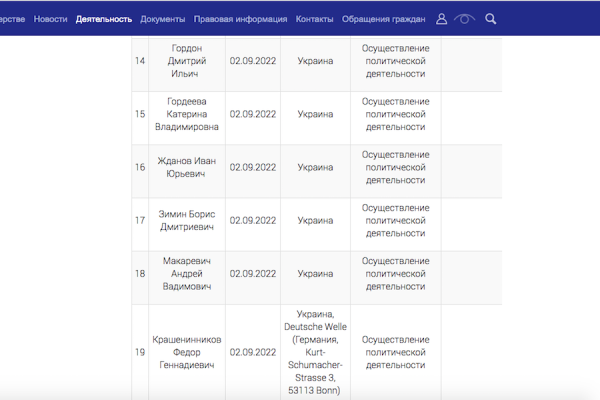 В список физлиц-иноагентов внесены журналистка Катерина Гордеева, лидер «Машины времени» Андрей Макаревич, украинский журналист Дмитрий Гордон (Росфинмониторинг включил его в список лиц, подозреваемых в причастности к терроризму или экстремистской деятельности, заочно арестован), политик Иван Жданов, предприниматель и общественный деятель Борис Зимин, политолог и публицист Федор Крашенинников.