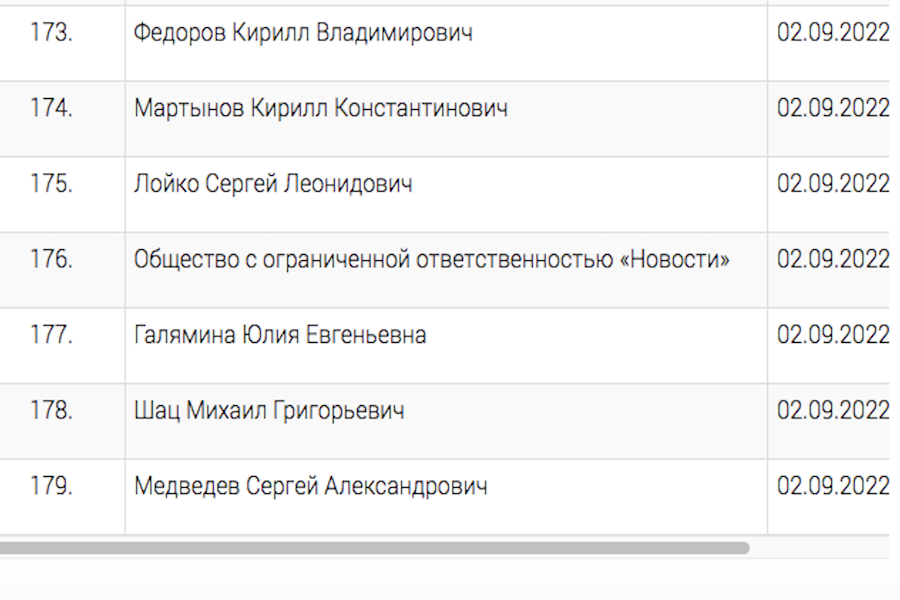 Минюст внес в реестр СМИ-иноагентов комика Михаила Шаца и оппозиционного политика Юлию Галямину. Также в реестр были включены Кирилл Федоров, главный редактор «Новой газеты. Европа» Кирилл Мартынов, журналист и философ Сергей Лойко, журналист и политолог Сергей Медведев и ООО «Новости».