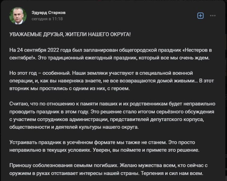 «Наши земляки участвуют в специальной военной операции, и, как вы наверняка знаете, не все возвращаются домой живыми... В этот вторник мы простились с одним из них, с героем, — написал он. — Считаю, что по отношению к памяти павших и их родственникам будет неправильно проводить праздник в этом году. Это решение стало итогом серьёзного обсуждения с участием сотрудников администрации, представителей депутатского корпуса, общественности и деятелей культуры нашего округа».