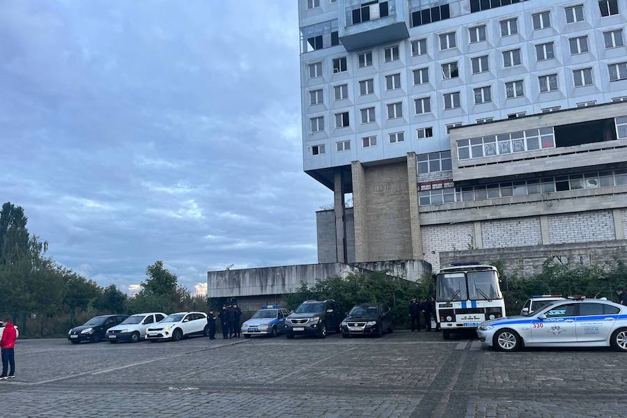 Там дежурят сотрудники в форме, сотрудники в штатском, периметр обходят кинологи с собаками.