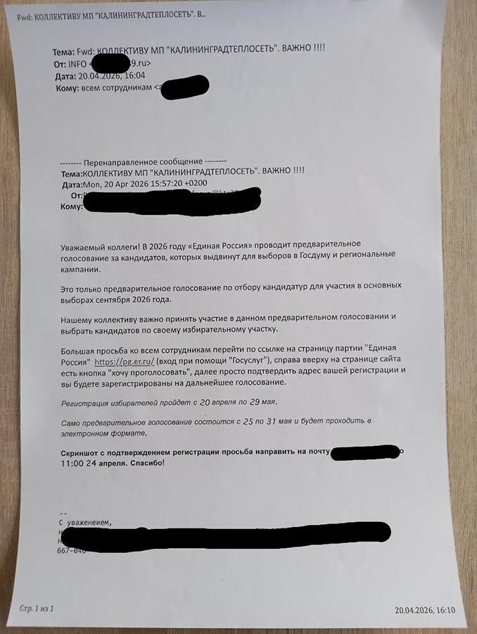 К посту приложена распечатка письма, как утверждает глава обкома КПРФ, из МП «Калининградтеплосеть» от 20 апреля 2026 года. В нём сотрудников просят перейти по ссылке на страницу партии «Единая Россия» и зарегистрироваться для голосования.
