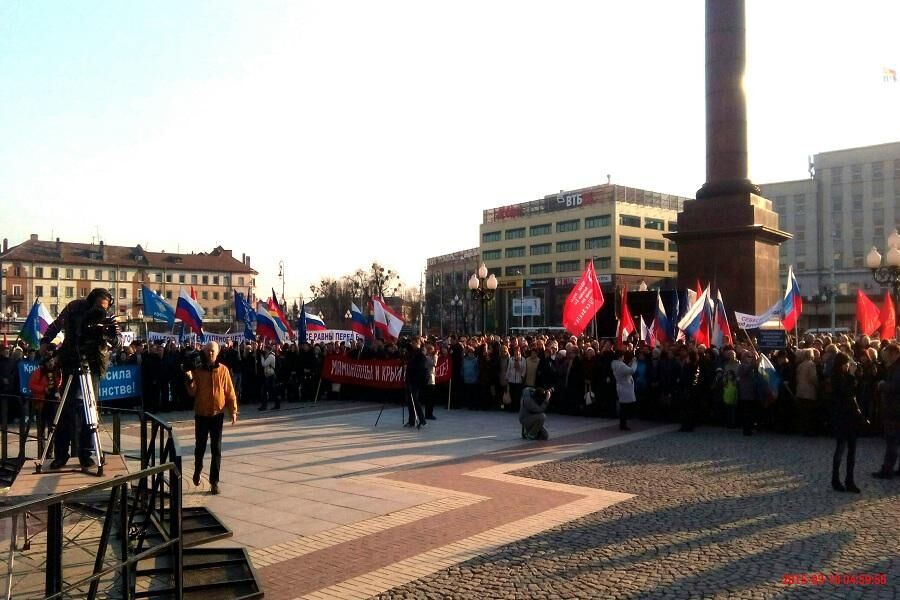 В Калининграде на площади Победы начался митинг, посвященный годовщине вхождения Крыма и Севастополя в состав России, передает с места событий корреспондент «Нового Калининграда.Ru».