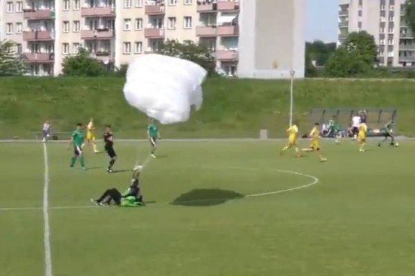 Инцидент случился в минувшее воскресенье во время игры дубля местной «Олимпии» с соперниками из Барчево (город в Варминско-Мазурском воеводстве). Парашютист, внезапно приземлившийся в районе центрального круга, сорвал начинавшуюся атаку гостей. Судья остановил игру, убедился, что с мужчиной все в порядке, и символически показал ему желтую карточку, после чего парашютист покинул поле.