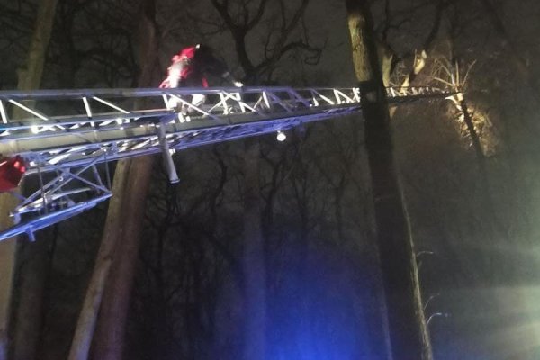 Обновлено (19:21): мужчину спустили по лестнице, а кот спрыгнул с дерева самостоятельно, когда пожарные пытались до него дотянуться.