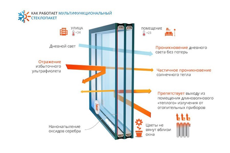 Итак, способов много, но не все знают про один, не менее действенный. Это даже не способ, а наличие в вашем оконном проеме окна с мультифункциональным стеклом. Такое окно оснащено стеклопакетом, в котором одно стекло мультифункциональное. Специальное напыление из серебра и других металлов на стекле создает эффект прозрачного фильтра. Именно это напыление из металлов обеспечивает отражение теплового излучения. Стекло пропускает видимый свет, но значительно снижает проникновение солнечной энергии в дом, т. е. отражает до 60% солнечного тепла. Зимой мультифункциональное стекло работает как энергосберегающие, отражает тепловую энергию обратно в квартиру или дом, уменьшая потери тепла на 100% и более. Его наличие позволяет создать комфортный микроклимат в квартире или загородном доме, а также сократить расходы на кондиционирование и отопление. Все это особенно актуально, если окна вашего жилища выходят на южную сторону.