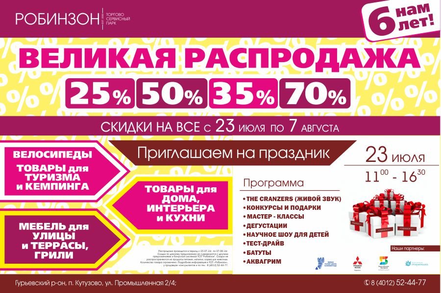 23 июля торгово-сервисный парк «Робинзон» отмечает свое 6-летие.
