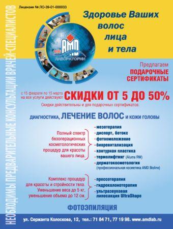 В АМД Лаборатории начата специальная акция: с 15 февраля по 15 марта действуют скидки от 5 до 50% на все процедуры и подарочные сертификаты.
