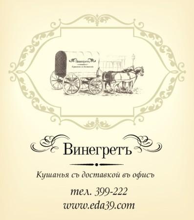 Для тех кто ценит рабочее время, работает от зари до зари и порой не успевает пообедать, или обходится перекусами необходимо прибегнуть к услугам «Винегрета». Позвоните по телефону 399-222 и Вы сразу почувствуете вежливое и обходительное отношение к себе. Представитель компании подробно расскажет Вам о нашем меню и поможет подобрать оптимальный способ организации питания для сотрудников Вашего офиса или предприятия. С февраля месяца компания «Винегрет» предлагает своим клиентам обновленное меню, а на время Великого Поста специальное постное меню. Вы можете зайти на сайт компании «Винегретъ» www.eda39.com ,где есть вся информация и меню на доставку обедов.