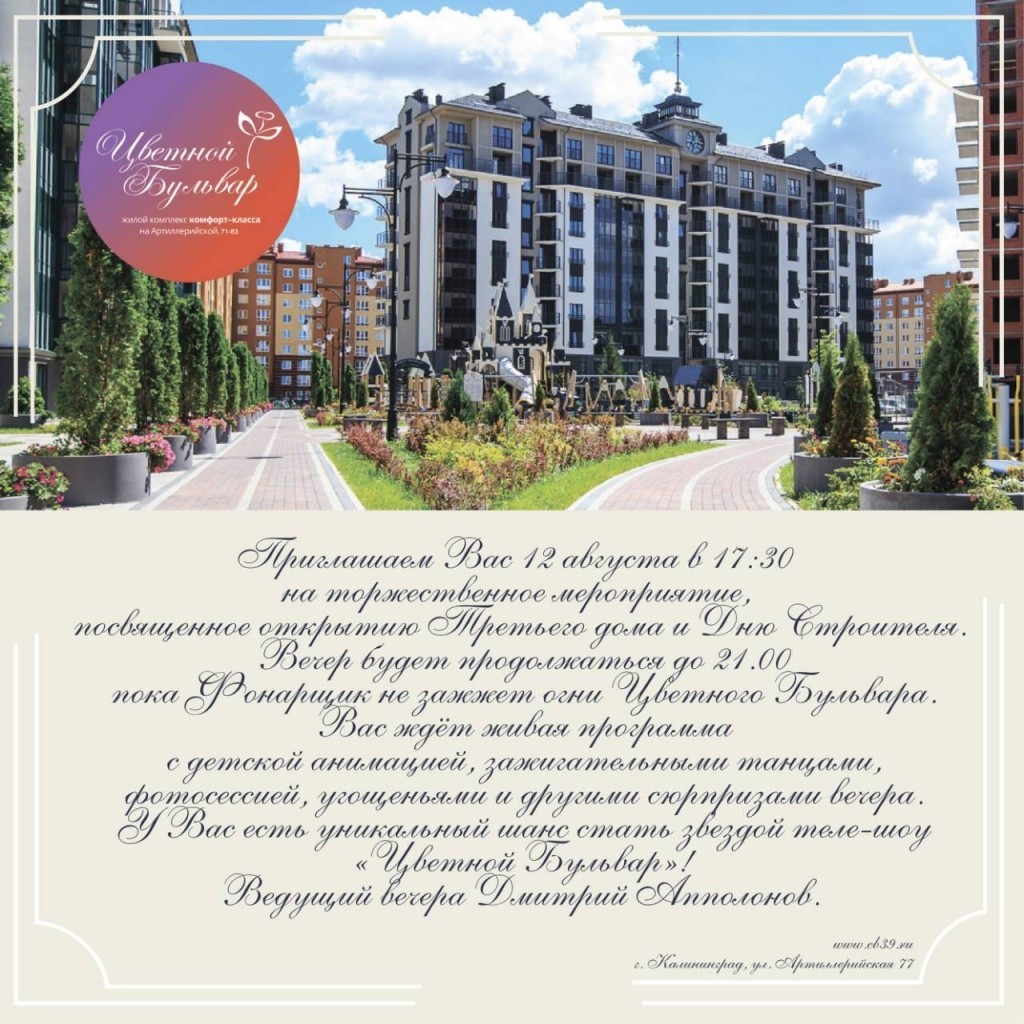 Группа «Овощи», детская анимация, угощения и счастливые дольщики — и всё это в связи с открытием нового, третьего по счёту, дома в жилом комплексе «Цветной Бульвар» и Днём строителя. Кстати, вы тоже приглашены на этот праздник.