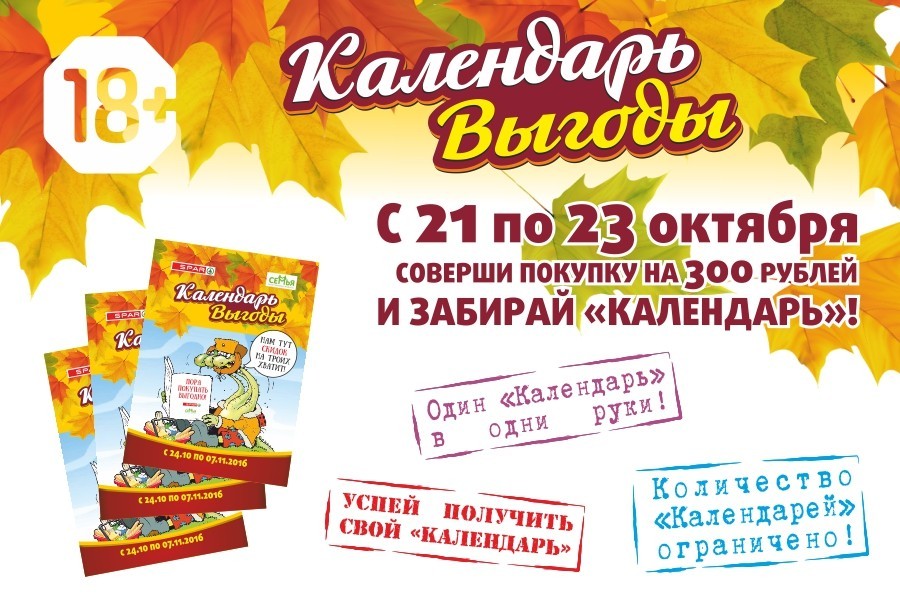 Получить пропуск в мир хороших цен и приятных бонусов легко. С 21 по 23 октября приобретите товар на сумму свыше 300 р. в любом из магазинов торговых сетей «Семья» и «SPAR». Помните: буклеты выпускаются ограниченным тиражом, так что не упустите свой «Календарь выгоды».