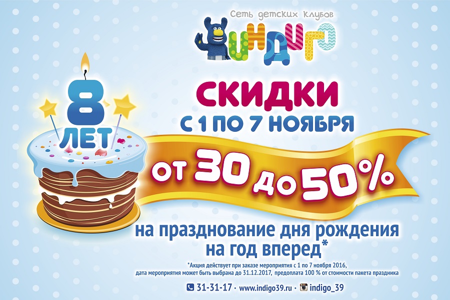 Детский день рождения в «Индиго»: теперь на 30% дешевле! На день рождения принято дарить самые желанные подарки, ведь это главный праздник в году! Сеть детских клубов «Индиго» на свое восьмилетие приготовила особенный презент для вас и ваших детей. Провести волшебный день рождения в «Индиго» теперь можно будет со скидкой в 30%. Для этого нужно лишь внести 100% предоплату в период с 1 по 7 ноября, и вы получите возможность провести яркое торжество без лишних трат в течение всего 2017 года!