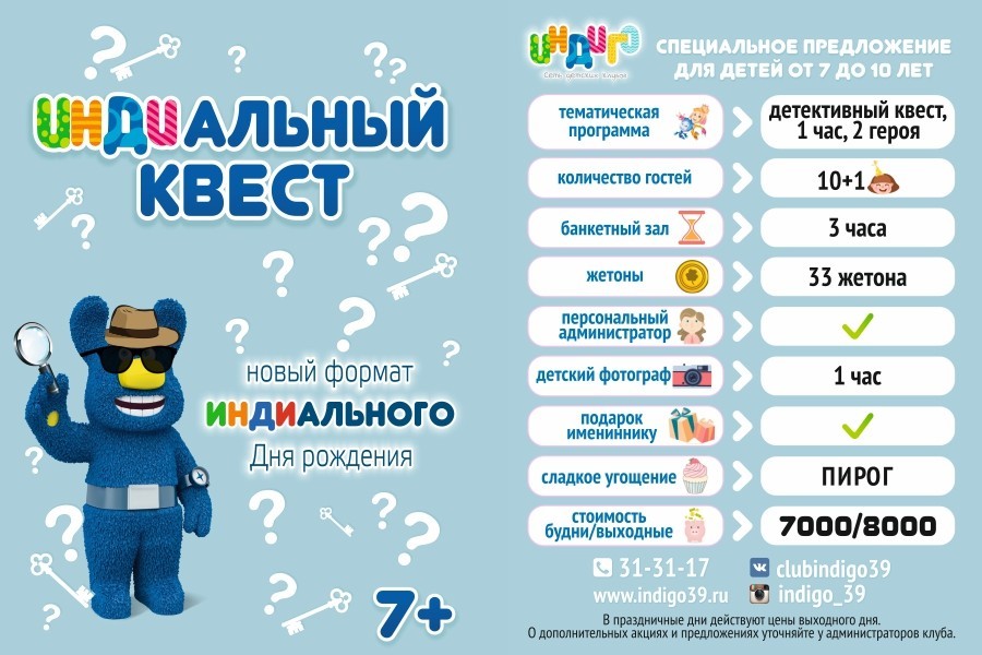 Ваш ребенок без ума от тайн и загадок? Специально для любителей разгадывать хитрые головоломки был запущен новый формат празднования — «ИНДИальный детективный квест». На него предусмотрена специальная скидка в 50%, которая при внесении полной предоплаты с 1 по 7 ноября будет также действовать до конца 2017 года.