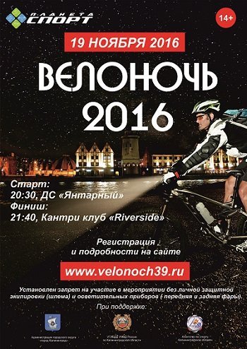 19 ноября 2016 года пройдет «Велоночь 2016 Калининград» — первый ночной велопробег, посвященный закрытию велосипедного сезона и пропаганде безопасного движения на велосипеде в городском пространстве.