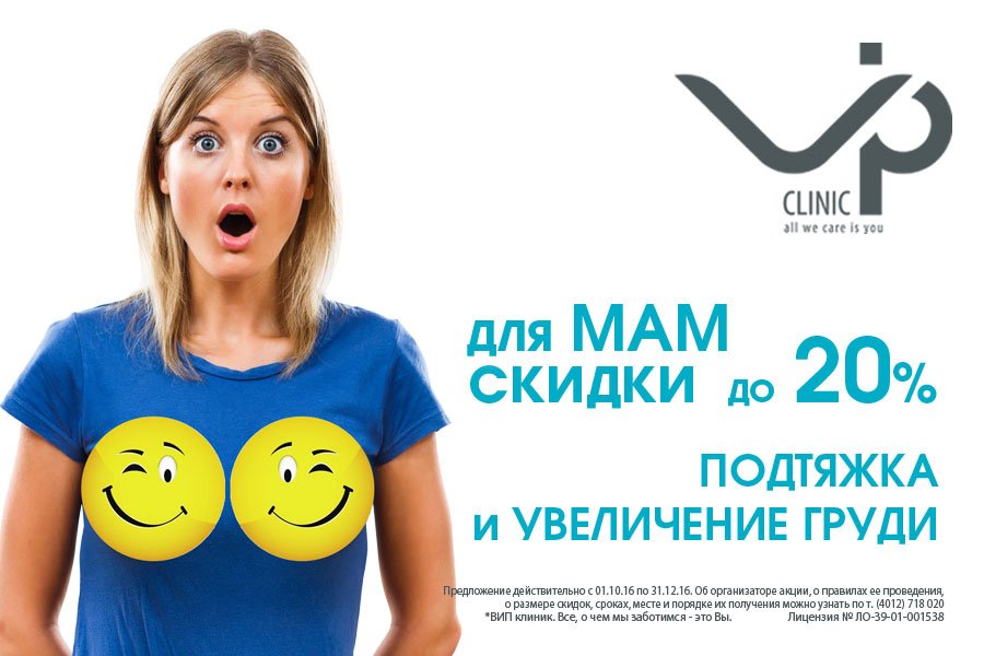До 31 декабря в «VIP Clinic» специально для мам действует скидка до 20% на наиболее востребованные после родов и завершения кормления услуги: увеличение груди, подтяжку груди и пластику живота. На услуги и операции предусмотрены рассрочка и кредит.