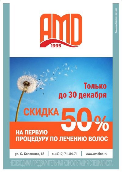 Спешите! Потому что до конца декабря действует чудесное предложение от «АМД Лаборатории»: 50 % скидка на первую процедуру по лечению волос.
