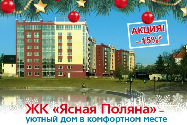 Ну а теперь о самом важном. С 1 декабря всем покупателям квартир в ЖК «Ясная Поляна» предоставляется скидка до 15%. Окончательный размер скидки зависит от площади квартиры. В комплексе можно купить квартиру площадью от 44 до 125 квадратных метров. Тем, кто любит квартиры попросторнее и может себе это позволить, подойдут роскошные пентхаусы от 165 до 208 квадратных метров с шикарным видом на город с высоты восьмого этажа. Стоимость квадратного метра с учетом новогодней скидки составляет от 54,5 тыс рублей за метр квадратный!