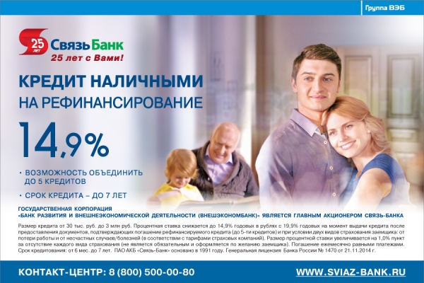 — Рефинансирование — это кредит, который предоставляется на погашение кредитов, взятых в других банках (кроме ипотеки), в том числе самых дорогих — по кредитным картам. Вы получаете деньги, погашаете свои кредиты и выплачиваете кредит на рефинансирование по ставке 14,9 процента1.