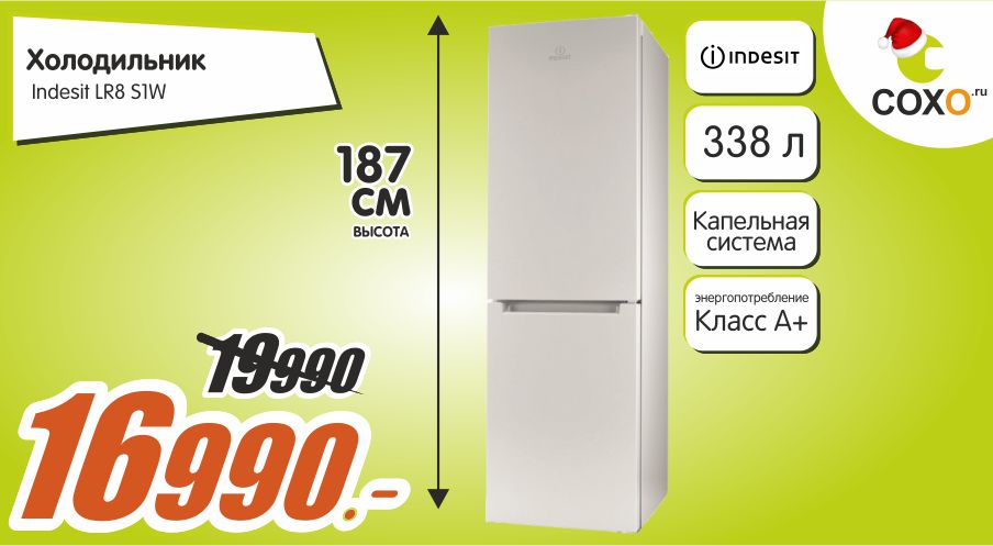 Холодильник Indesit LR8 S1W. Этот вместительный холодильник объемом 338 литров будет отличным приобретением для любой семьи. Он оборудован капельной системой разморозки, а его класс энергопотребления, А+. И все это всего за 16 990 рублей!