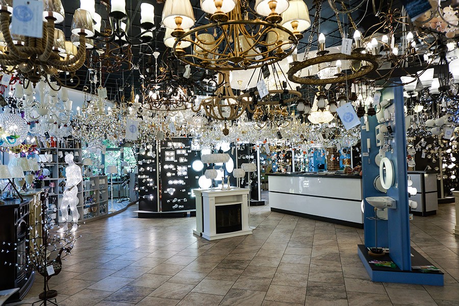 — самых разных размеров и форм. К примеру, играющие миллионами огней в хрустальных подвесках многометровые люстры — это единственное место в Калининграде, где представлены подобные образцы, потому что владельцы остальных магазинов просто не решаются их привозить.