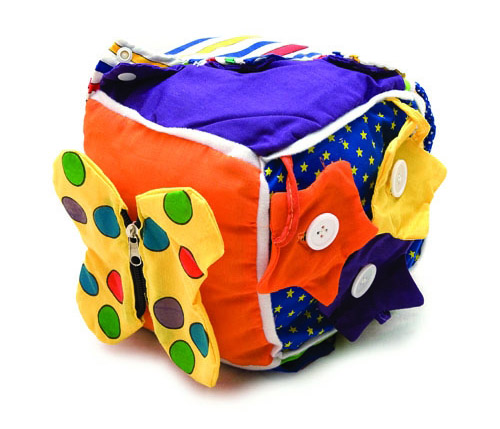 Отлично справится с этой задачей игрушка «Мягкий сенсорный куб». С каждой стороны куба расположены различные кармашки, пуговки, застежки.