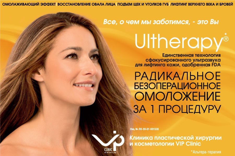 Недавно из США в Калининград прибыл именно такой иностранец: в клинике косметологии и пластической хирургии «VIP Clinic» появилась инновационная американская разработка Ultherapy® (или Альтера-терапия), сделавшая возможным то, что еще недавно казалось несбыточной мечтой: радикальное безоперационное омоложение за 1 процедуру!
