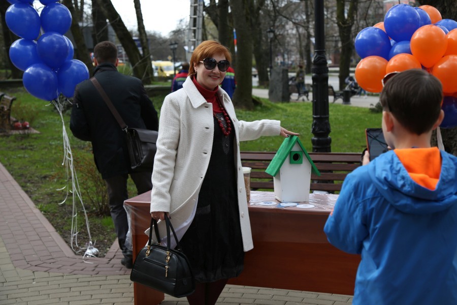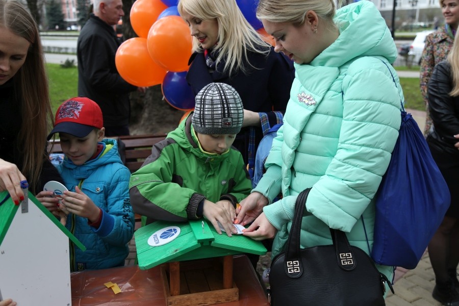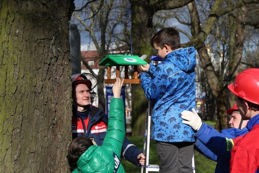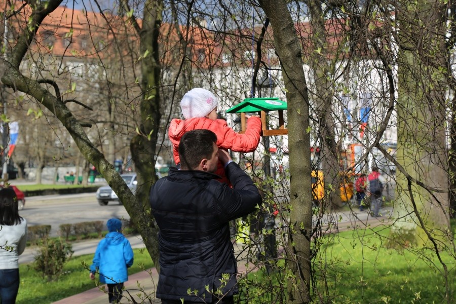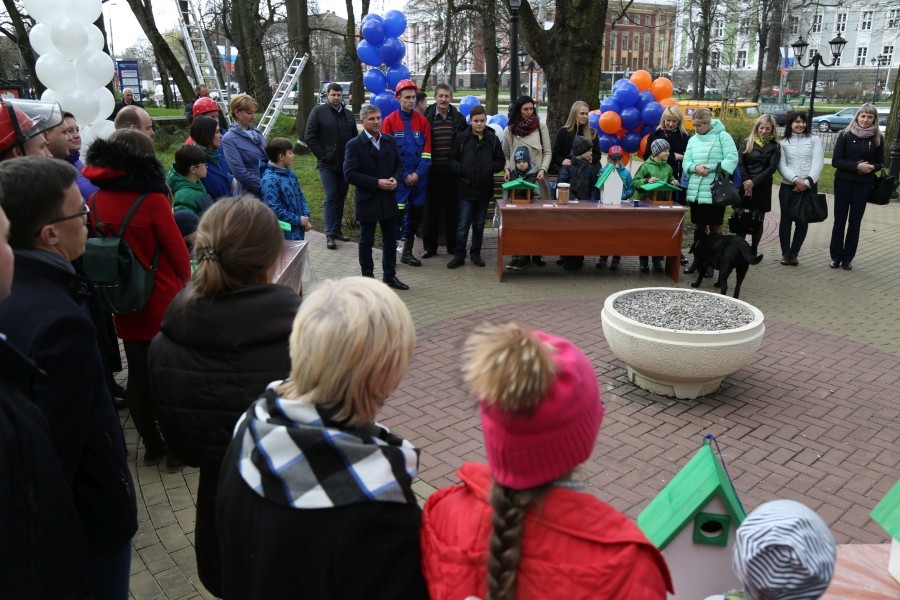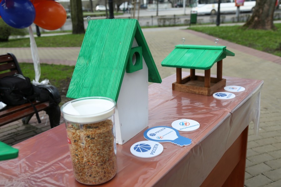Их развесили сотрудники АО «Янтарьэнерго» вместе с детьми. В экологической акции приняли участие более 50 человек. Кормушки размещены по всей территории сквера, они узнаваемы и досягаемы, поэтому покормить птиц сможет любой неравнодушный калининградец. «Домики» для птиц закрепили на веревки, чтобы не нанести вреда деревьям, растущим в сквере. По словам энергетиков, эта акция — первый шаг компании в поддержку экологического движения в России.