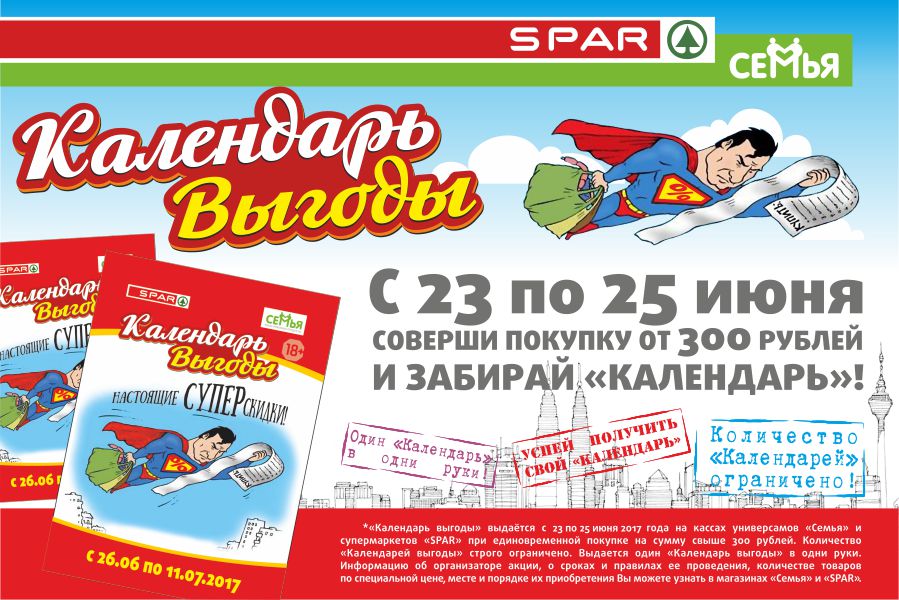 С 23 по 25 июня совершите покупку на сумму от 300 р. в любом супермаркете «SPAR» или универсаме «Семья» и получите свой экземпляр «Календаря выгоды» на кассе.