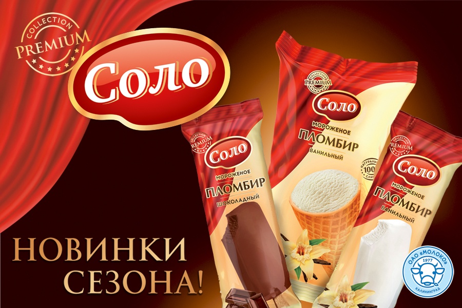 Новое мороженое «Соло» подарит вам незабываемое наслаждение и чувство приятной прохлады даже в самый знойный день! Его неповторимый вкус создается на современном оборудовании, в строгом соответствии с требованиями ГОСТ, по классической рецептуре, на основе натуральных сливок от местных фермеров Калининградской области!