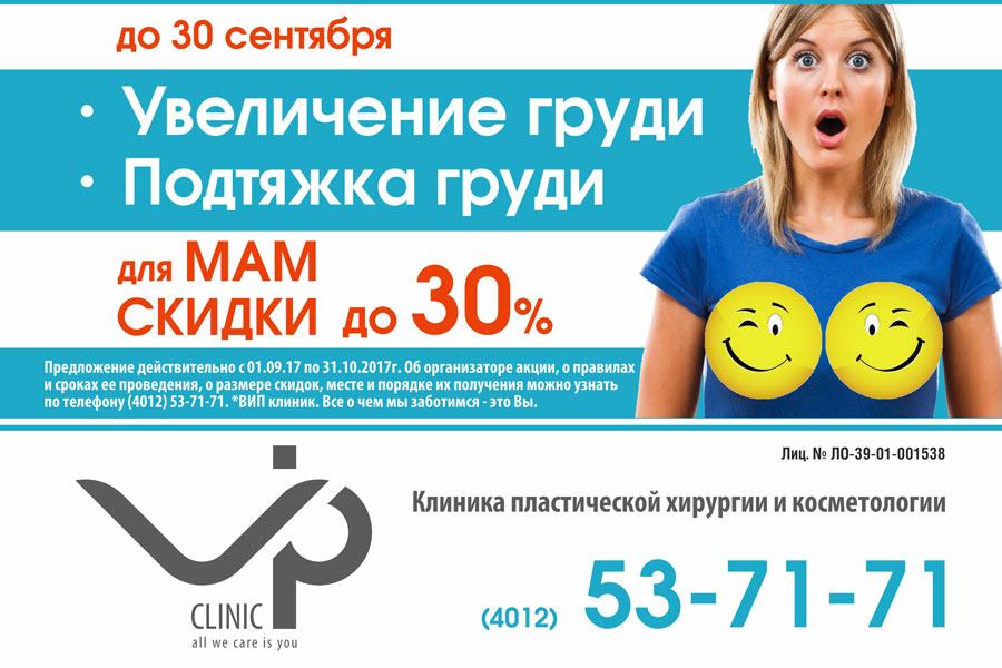 Успейте воспользоваться специальным предложением от «VIP Clinic», получите скидку до 30% на наиболее востребованные услуги маммопластики: увеличение и подтяжку груди. Цены в клинике вас приятно удивят, а если вам необходимы индивидуальные условия платежей, на все услуги предоставляется кредит*.