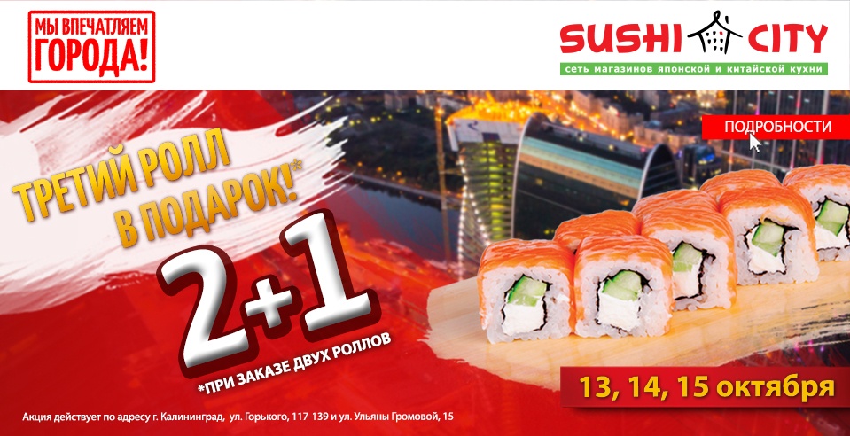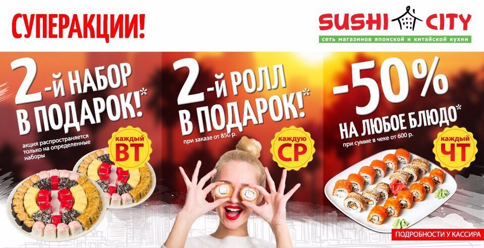 Со всеми подробностями акций можно ознакомиться на сайте www.sushi-city.com, а также через мобильное приложение, доступное на Android и iOS, либо уточнить у администраторов магазина.