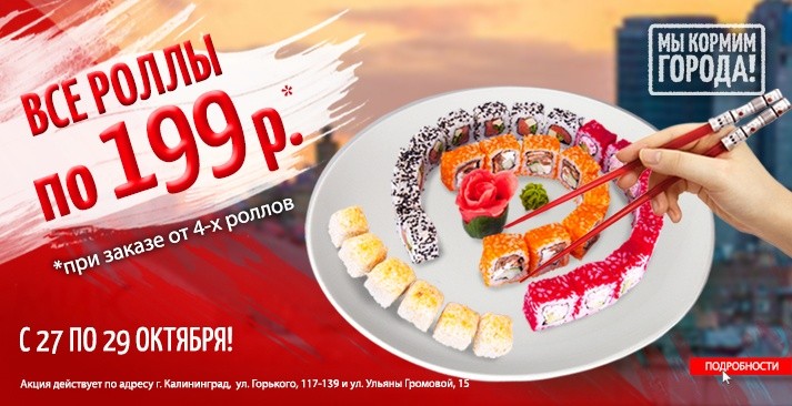 с 27.10 по 29.10 — при заказе от 4 роллов все роллы по 199 рублей!