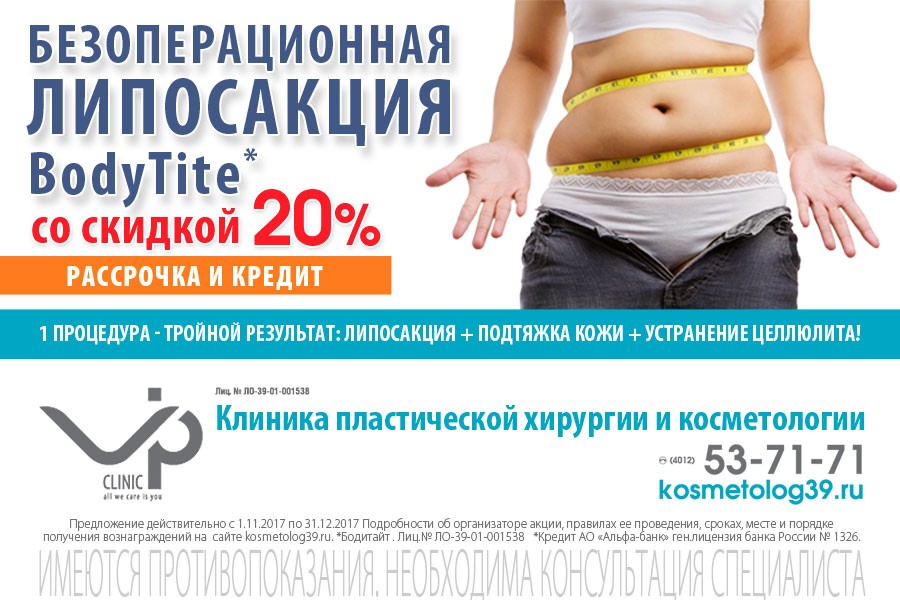 Стоит отметить, что технология BodyTite в Калининграде представлена эксклюзивно в нашей клинике. И до 30 ноября у нас действует акция: скидка 20% на безоперационную липосакцию BodyTite. Так что если вы хотите приобрести красивое, стройное и подтянутое тело, мы с радостью вам в этом поможем. Тем более что качеству наших услуг вы можете доверять.