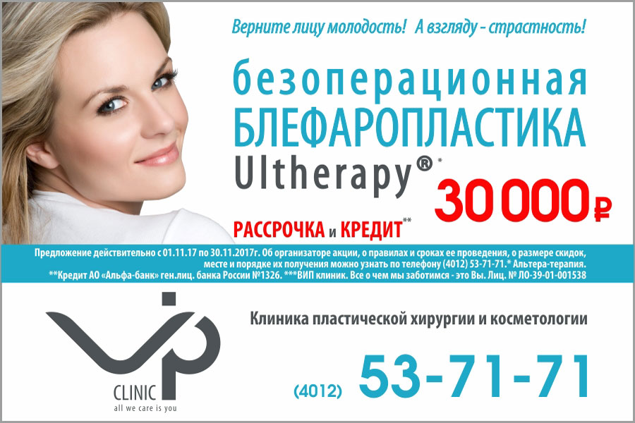 Успейте записаться на процедуру безоперационной блефаропластики Ultherapy® по специальной цене до конца ноября — всего 30 000 рублей — на сайте VIP Clinic или по телефону +7 (4012) 53-71-71.