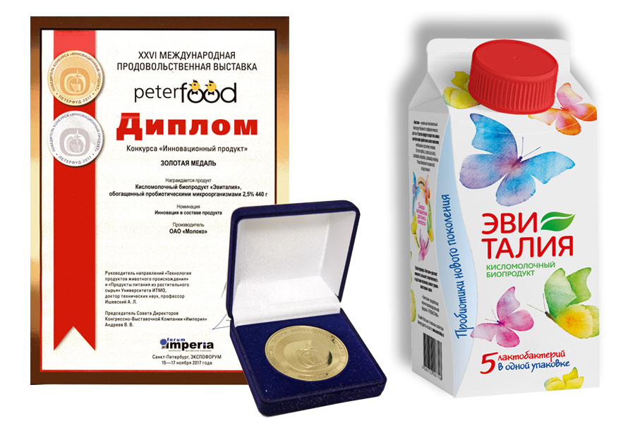 Новый кисломолочный биопродукт «Эвиталия» удостоился золотой медали в конкурсе «Инновационный продукт». Эксперты по достоинству оценили высокие вкусовые показатели продукта, а также его благотворное влияние на организм: содержащиеся в «Эвиталии» полезные лактобактерии способствуют укреплению иммунитета, восстановлению кишечной микрофлоры и нормализации работы кишечника.
