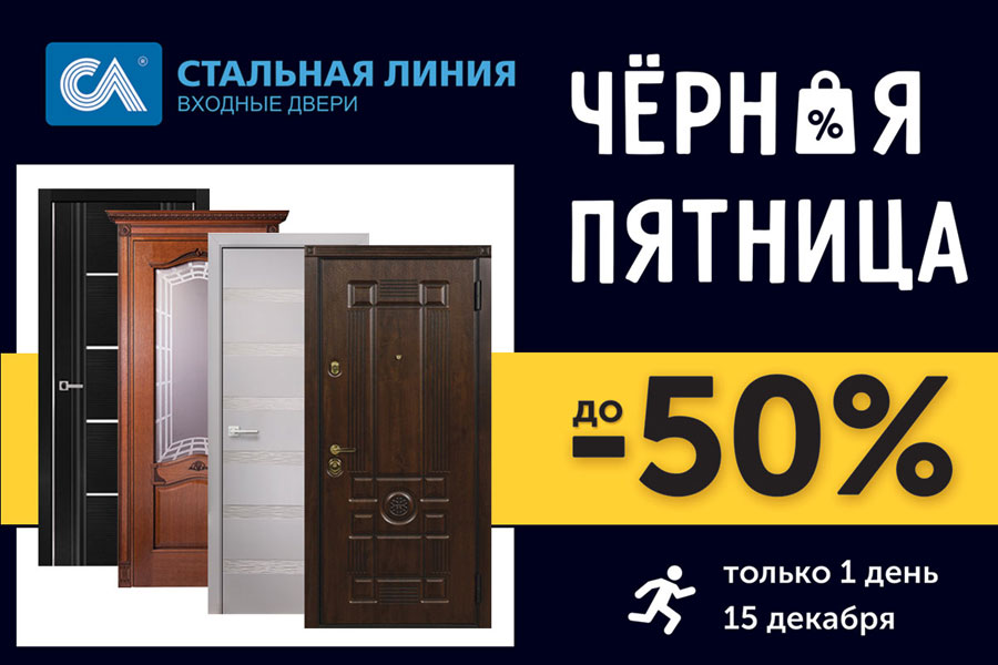Такое нельзя пропустить. Только один день. 15 декабря. В фирменном салоне «Стальная Линия» пройдет… «черная пятница»! Вас ждут скидки до 50% на абсолютно все входные и межкомнатные двери в наличии! А на двери по индивидуальному заказу только в этот день предоставляется скидка 10%!
