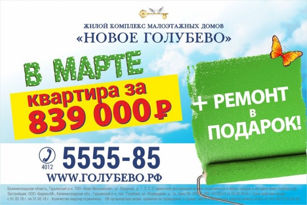 Только в марте у вас есть шанс купить квартиру в ЖК «Новое Голубево» всего за 839 000 рублей, да еще и получить к ней в подарок абсолютно бесплатный ремонт!