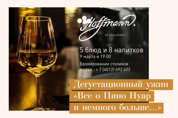 В пятницу, 9 марта, в ресторане Hoffman при поддержке клуба «PROвино» состоится дегустационный ужин «Все о Пино Нуар и немного больше…». Проведут вечер эксперты клуба «PROвино» Зоя Баранова и Сергей Хмилевский, которые расскажут о вкусовых тонкостях напитка, его истории и эстетике. «Будем говорить и показывать, слушать и пробовать, и дегустировать, дегустировать, дегустировать…»