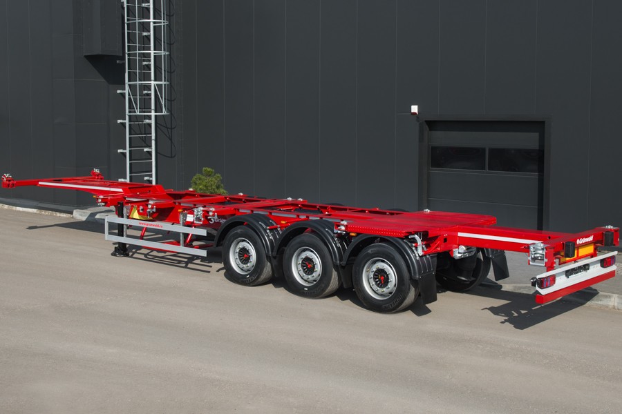 Основные преображения в классической схеме низкорамного контейнеровоза произошли в задней части, где появился раздвижной механизм, перемещающий заднюю фитинговую балку, бампер и брус. При этом сохраняется ряд базовых преимуществ: высокая универсальность, простота и надежность конструкции.